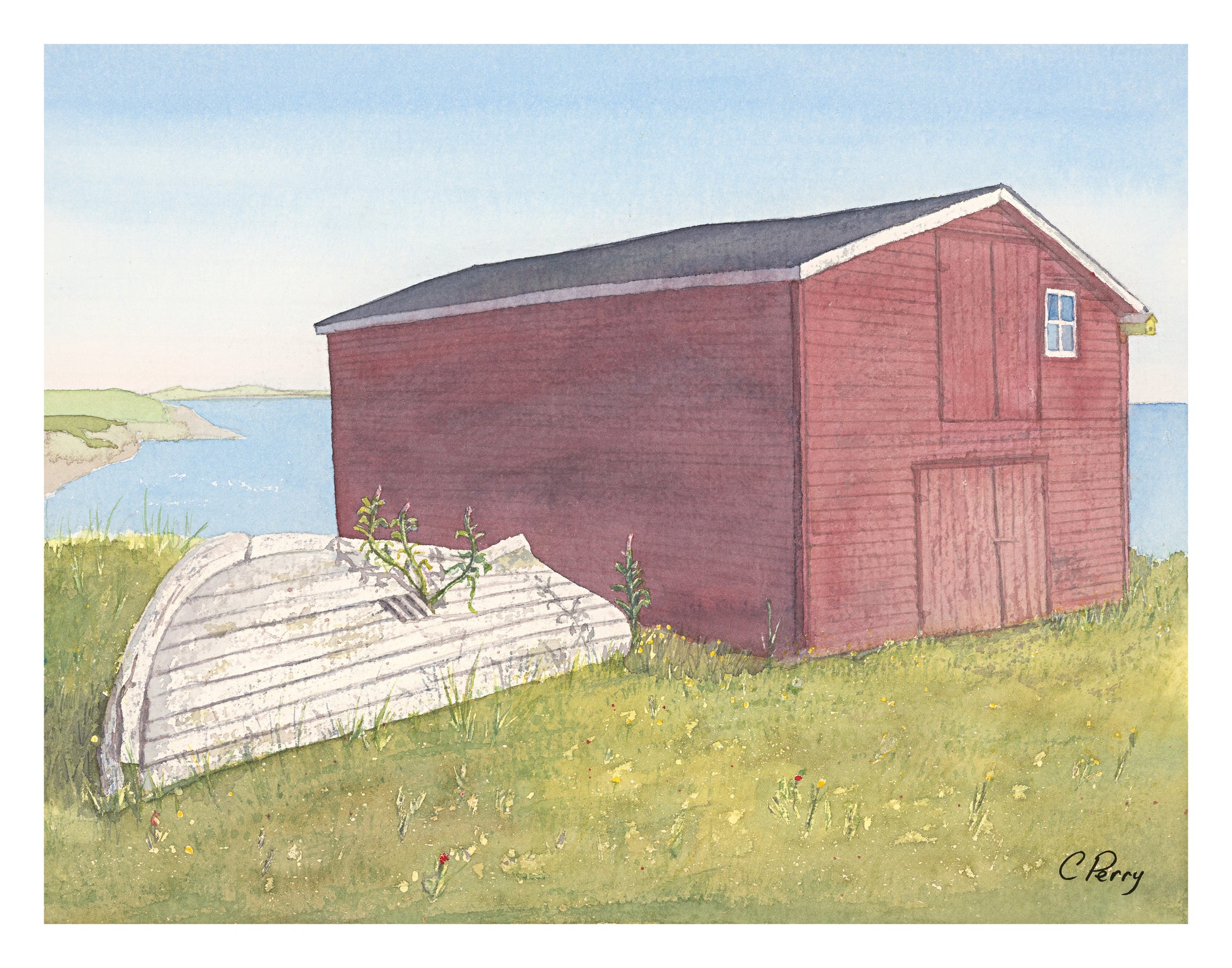 This print is a watercolour reproduction painted in 2024, with an outside dimension of 11”x14”. Designed to work in a matted 16”x20” frame, this print ideal for adding a maritime nostalgia to any room. This is a rendition of Uncle Max’s fishing stage, decades after its days of glory.